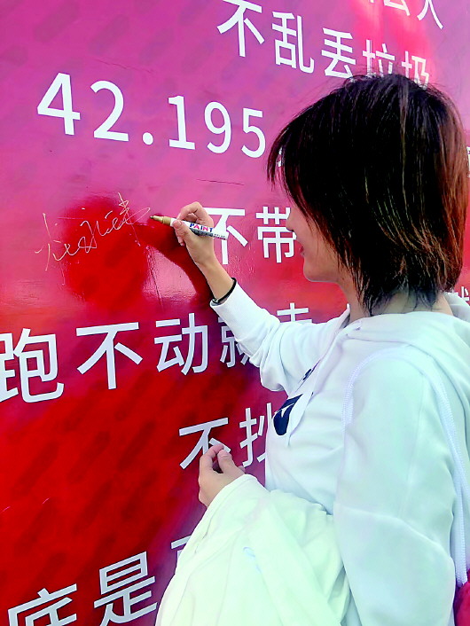 同样有很多人围观的还有一面签名墙。每位跑友都可以在墙上签下自己的名字,或者写上一句鼓励自己的话。“感觉像立下了‘军令状’,这下自己可得好好跑了。”一名签下自己名字的跑友笑着说。