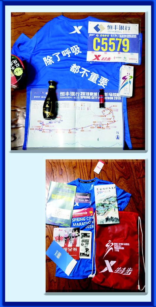 齐鲁晚报·齐鲁壹点记者注意到,每个参赛包都鼓鼓的,几乎再也放不进去东西了,跑友张先生向记者展示了自己参赛包里的东西,有本次恒丰银行2019泉城(济南)马拉松的定制T恤、号码布、参赛指南、济南十里清泉旅行图、代金券以及牛奶、方便面、退热贴、阿胶口服液和小瓶纪念酒等。