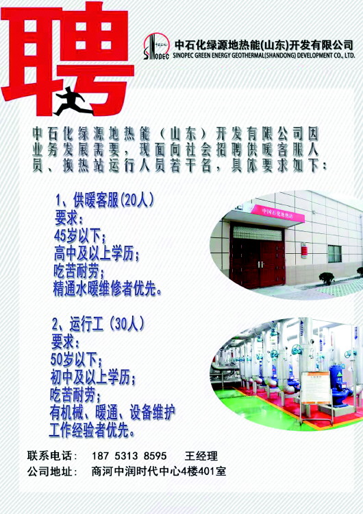 随着公司的发展,现招聘50人,包括供暖客服20人,运行工30人,有温度的工作等你来呦!欢迎大家加入我们!有意向者可联系王经理。