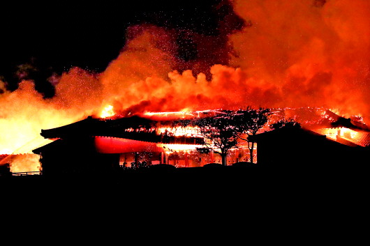 由于首里城几乎为纯木质结构,正殿、北殿在夜间已全部烧毁,南殿清晨也确认烧毁。此外,火势蔓延至正殿前的奉神门和邻接南殿的书院,藏有大量珍品古籍的书院也遭焚毁。