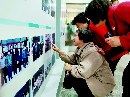 医院退休的老职工在院史长廊寻找过去的记忆。