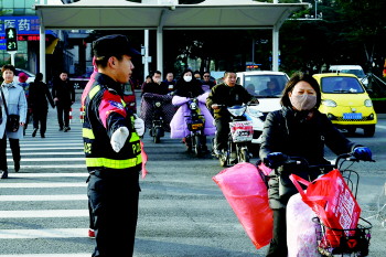 每日,在商检岗上,都会重复着这样的暖心画面。随着信号灯的变换,公安、交警、志愿者们有序穿梭于道路两侧,他们以身作则,用文明礼仪进行劝导,勾勒出和谐美好画面。图为市民在商检岗文明出行。
