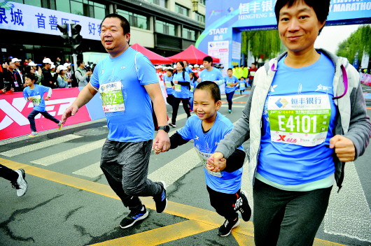 马拉松考验的是人的毅力,全家人一起跑无疑会让这种坚持更有韧劲。11月2日,马拉松的现场就有不少的家庭组合。董运平父子三人就是其中典型代表,这一次,董运平特意带着一对9岁大的双胞胎儿子前来参赛。
