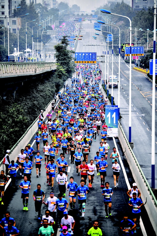 参赛选手奔跑在宽阔的经十路上,场面壮观。 齐鲁晚报·齐鲁壹点记者 刘涛 摄