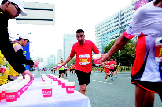 赛道上,组委会为选手们精心准备了充足的饮用水、饮料以及其他能量补给;济南市公安局、卫健委、公交公司等部门,全心全意提供安保医疗等方面的服务,保障赛事的顺利进行;赛道上还有数千名志愿者、数百名警察护跑团,随时观察赛道上发生的各类情况,为参赛选手提供帮助。