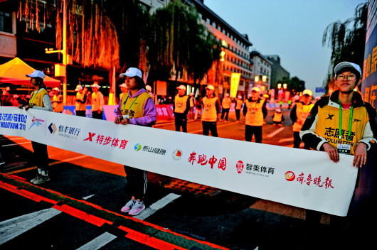 恒丰银行2019泉城(济南)马拉松赛上,除了挑战自我、超越极限的参赛者,无处不在的“黄马甲”们也汇聚成了一道独特而靓丽的风景线。近两千名志愿者为泉马保驾护航,他们用微笑、鼓掌、点赞等方式为跑友打气,彰显“好客山东”。