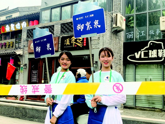 啦啦队员手持济南72名泉的展板,推介泉水文化。
