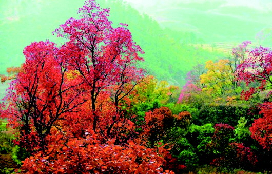 米亚罗的红叶由高到低,层次分明地从山顶红到河谷,满山红叶竞相争艳。