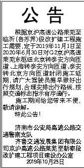 公告 根据京沪高速公路莱芜至临沂(鲁苏界)段改扩建工程施工需要,定于2019年11月1日至2020年6月30日对G2京沪高速莱芜东枢纽北京转泰安方向匝道、上海转泰安方向匝道、泰安转北京方向匝道封闭施工延期,请广大驾驶员提早做好出行规划,合理安排出行路线,按照交通标志指示有序通行。 施工期间给您带来不便,敬请谅解。 特此公告! 济南市公安局高速公路交通警察支队 齐鲁交通发展集团有限公司京沪高速公路莱芜至新泰段改扩建工程项目建设办公室 2019年10月25日