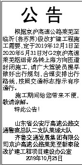 公告 根据京沪高速公路莱芜至临沂(鲁苏界)段改扩建工程施工需要,定于2019年12月1日至2020年5月31日对G2京沪高速莱芜枢纽青岛转上海方向匝道封闭施工,请广大驾驶员提早做好出行规划,合理安排出行路线,按照交通标志指示有序通行。 施工期间给您带来不便,敬请谅解。 特此公告! 山东省公安厅高速公路交通警察总队二支队莱城大队 齐鲁交通发展集团有限公司京沪高速公路莱芜至新泰段改扩建工程项目建设办公室 2019年10月25日