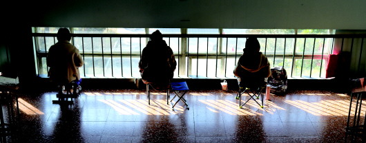 记者发现,有学生甚至将写字桌椅搬进了走廊中,而马扎、水壶、棉衣等日用品成了“必备神器”。“上午还好,到了晚上这边温度会比较低,拿件备用衣服来御寒呀。”一位考研学生抬起头,话还没说两句,又把头扎进了书海中。
