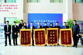 济宁市不动产登记中心工作人员收到多面锦旗。 本报记者 孔茜 摄