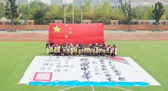 10月23日,枣庄市实验小学师生在刚刚写成的“爱我中华”等巨幅大字前合影。当日,该校开展“百人同书 千人同诵”主题教育活动,百名师生在千人齐诵《可爱的中国》旋律下,挥毫写下以爱我中华为中心的语句,表达对祖国的热爱之情。(通讯员 胡乐彪 摄)