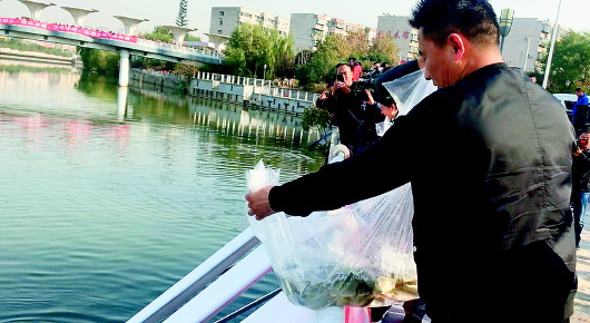 11月12日上午,济南市农业农村局在小清河无影山码头举办2019济南“放鱼养水”启动仪式。现场20万尾鲜活的小鱼集体搬入了“新家”——小清河,它们将一刻不停地在水中游动,并吃掉水中的水草和藻类,为净化小清河水质尽自己最大的努力。 齐鲁晚报·齐鲁壹点见习记者 任玉停 摄