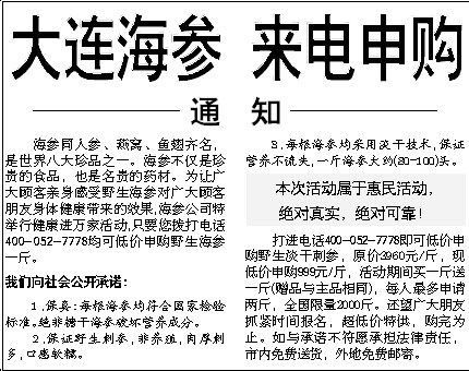 打进电话400-052-7778即可低价申购野生淡干刺参,原价3960元/斤,现低价申购999元/斤,活动期间买一斤送一斤(赠品与主品相同),每人最多申请两斤,全国限量2000斤。还望广大朋友抓紧时间报名,超低价特供,购完为止。如与承诺不符愿承担法律责任,市内免费送货,外地免费邮寄。