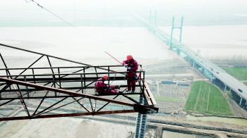 员工对220千伏万盐线跨越黄河铁塔进行检查。