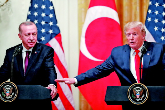 11月13日,在美国华盛顿白宫,美国总统特朗普(右)与土耳其总统埃尔多安出席联合记者会。 新华社发