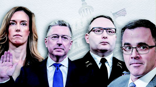 特朗普给泽连斯基打那通引来弹劾调查之祸的电话时,前三人作为白宫和国务院的团队成员亲耳听到两人通话内容,只有沃尔克不在场,但他作为乌克兰问题特使经手过后续事宜。