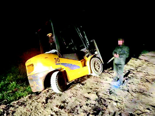 根据报警人描述的情况,在到达现场附近时,许文军并没有发现犯罪嫌疑人的踪迹。他闭灯低速驾驶车辆沿路查看,当行至阎码村南头生产路时,突然发现前方有一辆叉车铲着一个圆形物体左转弯向阎码村方向行驶,形迹可疑,许文军意识到极有可能就是盗窃嫌疑人。