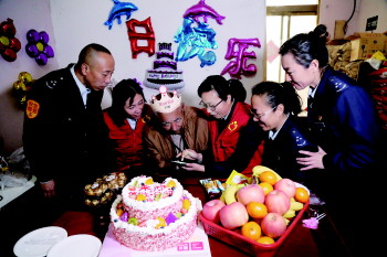 当“70”造型的蜡烛点亮,众人齐唱生日歌时,朱长柱老人也像孩子一样跟着唱歌。“虽然我没有儿女,但此时此刻我觉得,我比很多有儿女的都幸福。”老人噙着眼泪说。