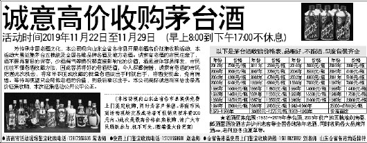 为传承中国老酒文化,本公司现向山东全省各市县开展老酒高价征集收购活动,本活动大量征集茅台五粮液及全国各地品牌名酒及地方老酒。请家有老酒的市民注意了,酒不要再盲目的保存,少酒漏气等情况都直接影响它的价值,酒是液体容易挥发,市民往往不懂老酒收藏方法,因此容易将好的老酒贬值,令人深感惋惜,请家有老酒的市民把握此次机会,将常年积压或收藏的批量老酒该出手时就出手,将酒变现金,免有惋惜。等待与观望只会降低老酒的价值,到最后难以出手。本公司满怀诚意而来给出最高价征集收购,本次征集活动公开公平公正。