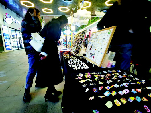 1992年出生的王光荀和妻子一起在悦立方后面的街区摆摊,零零碎碎卖的都是些胸针、耳钉等女孩子喜欢的小玩意儿。“这些耳钉都是她自己做的,她有自己的微店,全职干这个。”王光荀说,带流苏的、带亮片的、带卡通图案的,说起自己妻子亲手做的作品,王光荀很是骄傲。最近,妻子去上海参加一个时尚展了,晚上摆摊的工作就落到了王光荀的头上。“我是白天上班,晚上过来陪着她摆摊,结果现在我成了主力了。”他笑着说。