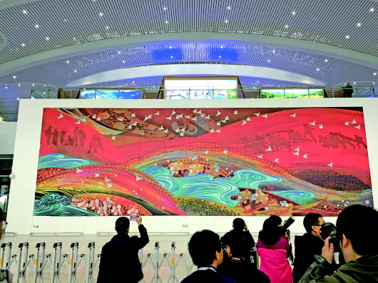 ◥临沂北站候车厅二楼,“万山红遍”的壁画吸引了很多人驻留欣赏。