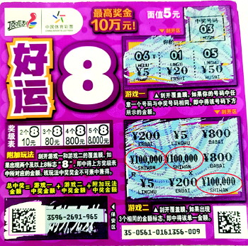 刮开“好运8”,幸运带回家,体彩顶呱刮新票“好运8”上市以来,以其精美的票面设计,不俗的返奖,迅速火遍滨州彩市,近日,幸运的滨州购彩者王先生(化姓)再次发力,揽获头奖10万元,真是令人羡慕不已。