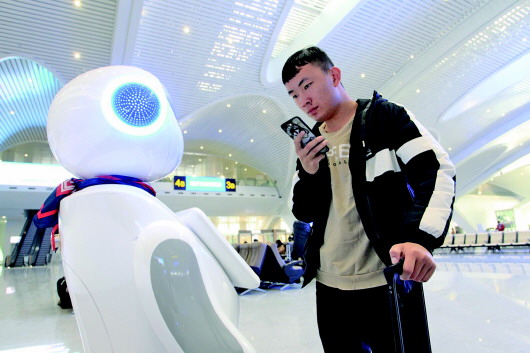 临沂北站候车大厅内的机器人为旅客提供问询服务。 齐鲁晚报·齐鲁壹点记者 王鑫 摄
