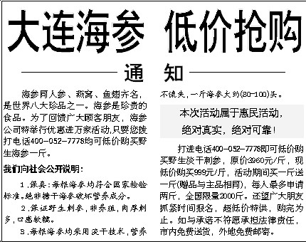 打进电话400-052-7778即可低价购买野生淡干刺参,原价3960元/斤,现低价购买999元/斤,活动期间买一斤送一斤(赠品与主品相同),每人最多申请两斤,全国限量2000斤。还望广大朋友抓紧时间报名,超低价特供,购完为止。如与承诺不符愿承担法律责任,市内免费送货,外地免费邮寄。