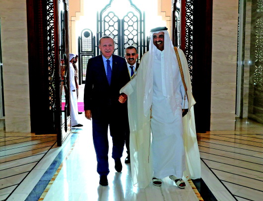 ◥25日,在卡塔尔首都多哈,卡塔尔埃米尔(国家元首)塔米姆(右)会见土耳其总统埃尔多安(左)。