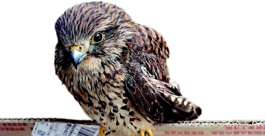 26日上午,记者来到了刘女士的工作单位看到了这只小家伙。它的状态明显好了很多,甚至已经可以飞到人的肩膀上。鸟儿全身成棕褐色,身上布满了纵纹和横斑,最为抢眼的便是它金黄色的脚格外显眼。记者注意到,它受伤的地方是在左侧翅膀的中部,也正因此,小家伙即便是飞起也不是很平稳,很快就会降落。
