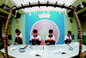 厅廊墙上和空中均悬挂着学生的软笔书法作品。并设置了即时练笔的“写字吧”,“写字吧”里有水写布、毛笔等工具供学生自行练习书法作品,给孩子们营造了一个自由展示自我的平台。此外,学校更新了走廊文化,营造了浓厚的书法氛围。每个教室的走廊墙壁上都设立了“知世界美汉字”栏目,作为各个班级教师、学生的硬笔书法作品展示评比台,每两周更新一次,并评出班级“金笔”进行激励。尽管校园面积有限,但艺术魅力无穷,这种教师引领、班级金笔展示的美汉字展示园地,让学生在潜移默化中受到书法艺术的熏陶。