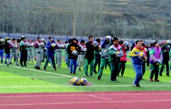 沂源县三岔中心学校利用课间组织学生共做排球操。