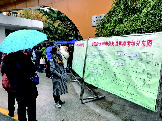 11月30日上午8点30分左右,山东师范大学附属中学校本部门前,考生和家长正在看考点分布图。