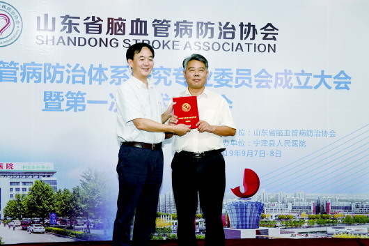 党总支书记、院长张士森(右)当选山东省脑血管病防治协会基层脑血管病防治体系研究专业委员会主任委员,图为山东省基层脑血管病防治协会会长曾现伟(左)为其颁发证书