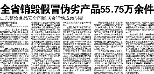 截至目前,全省共销毁假冒伪劣产品55.75万余件,重量1206.8吨,涉案金额2317.6万余元;取缔无证经营等违法违规主体8047家,责令停产停业147家;全省共抓获犯罪嫌疑人1417人,受到从业禁止、行政拘留等行政处罚共3493人;全省通过新闻媒体曝光典型案例546件,官方网站信息公开4783件;省级印发或正在征求意见的制度文件19件,包括《山东省学生营养健康与学校食品安全提升实施意见》《网络餐饮服务管理办法》等,建立校园周边食品安全网格化监管和风险分级监管2项制度。各市完善长效机制102件,县级完善制度312件。