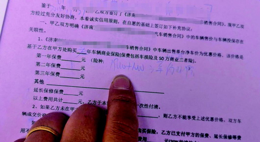 据申先生介绍,他是去年12月在该汽车销售店买的车,当时花了50多万元,除了47万多的购车款,还有GPS、服务费和两万元的保险费等。“当时让我连交三年的保险费,我说交多少钱得给多少发票,他们说不行,得第二年、第三年才能开。”