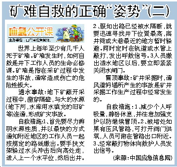 自救措施:1、首先要尽力辨明水源性质,并以最快的方式通知附近地区的工作人员一起按规定的路线撤出。要手扶支架躲过水头冲击后向高处走,进入上一个水平位,然后出井。2、假如出路已经被水隔断,就要迅速寻找井下位置最高,离井筒或大巷最近的地方暂时躲避。同时定时在轨道或水管上敲打,发出呼救信号。3人员撤出透水地区以后,要立即紧紧关闭水闸门。