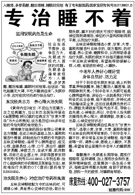 入睡难、多梦易醒、醒后难睡、睡眠时间短 有了专利新国药(国家发明专利号ZL01128603.2)