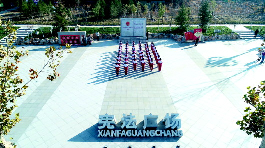 长清区第二实验小学将宣传活动地点选在了长清区人民的“大客厅”——文昌山扁鹊主题文化公园的宪法广场。一大早,学生代表来到新落成的公园内的宪法广场进行集体朗读宪法。