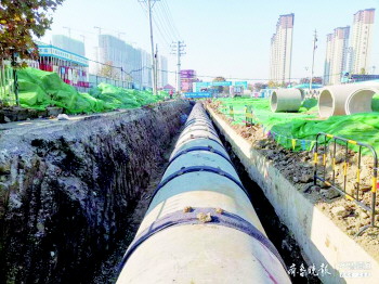 据项目专业工程师张建新介绍,济安桥南路至济宁第一粮库段综合管廊已经全部施工完成,管廊回填工作也基本完成。现在济安桥南路至环城西路雨水管施工已完成257米,雨污水管道铺设完就将进行回填,预计本月底此段雨水管完成土方回填。