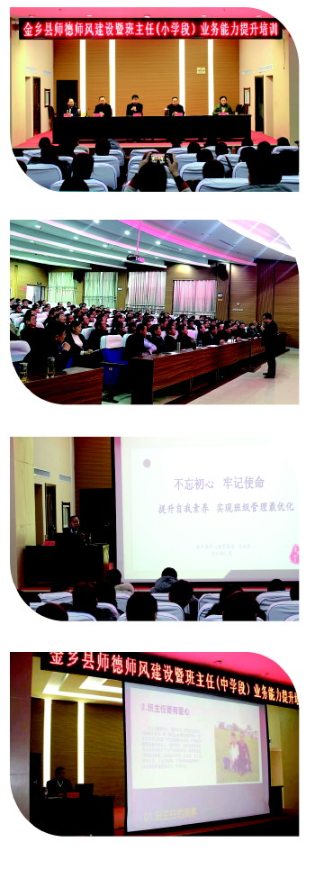 安排县功勋校长为全县一线班主任面对面培训,可见金乡县教育系统对加强教师队伍建设的力度与决心;金乡县教体局分管领导、相关科室负责人与广大班主任面对面交流,解读分析政策、共谋学校发展建设,可见该县在新校、高楼、大操场建起来之后,对软实力提升的思考与实践;会议室场地有限、一次培训容纳群体也有限,从宁愿坐在板凳上也要调好课前来加塞学习参加培训的“后场”情况,可见金乡县教师学习热情的高涨程度以及对提升自身实力的迫切愿望。师德师风建设,正是在县教体局的统一科学规划这个顶层设计中,在不断引领教育干部干事创业、广大教师爱岗敬业中不断朝着更好、更强发展。