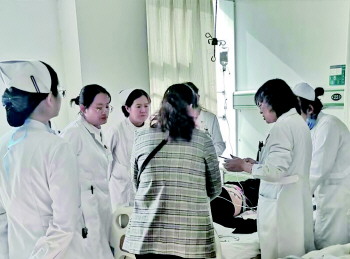 近日,市北区人民医院内四科林海玲主任像往常一样带领医生、护士例行查房。突然护士报告:有一位中年男性昏倒在地,失去呼吸及血压,不省人事,病情十分危险。林主任立即中断查房,组织全科医护人员全力以赴抢救。经急诊颅脑CT平扫,示为突发脑血栓。一个小时及时有效抢救,患者生命体征趋于稳定。