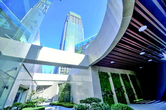 通过下行扶梯,记者来到地下约10米深的露天广场,两旁是青翠的绿植,鹅卵石铺底的水池清澈明净。临近车站侧壁安装了透明玻璃,阳光穿过玻璃撒向奥体中心站室内地面。在广场内仰望外侧,是国际金融城林立的高楼。一处是城中静谧的小花园,一处是车水马龙高楼林立,“城市溪谷”内外形成了鲜明对比。