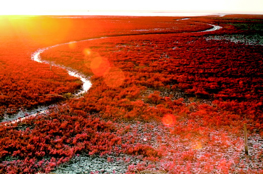 每年四月,碱蓬草长出地面,初为嫩红,渐次转深,秋季由红变紫。碱蓬草不用撒种,无须耕耘,在盐碱卤渍里,年复一年地生长,造就了举世罕见、总面积达20余万亩的辽河三角洲湿地“红海滩”,形成了一处自然环境与人文景观完美结合的纯绿色生态旅游系统。