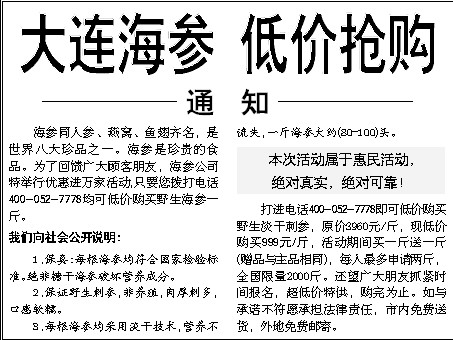 打进电话400-052-7778即可低价购买野生淡干刺参,原价3960元/斤,现低价购买999元/斤,活动期间买一斤送一斤(赠品与主品相同),每人最多申请两斤,全国限量2000斤。还望广大朋友抓紧时间报名,超低价特供,购完为止。如与承诺不符愿承担法律责任,市内免费送货,外地免费邮寄。