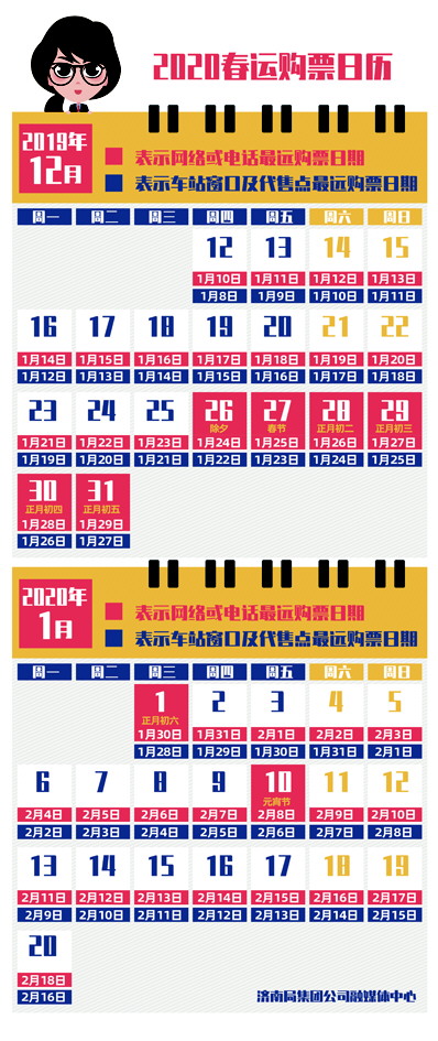 本报济南12月11日讯(记者 王瑞超) 记者从中国铁路济南局集团公司获悉,12月12日起,铁路部门将开始发售2020年春运火车票,旅客可以通过网络、电话等方式预订春运首日车票。由于火车站售票窗口、代售点的购票预售期为28天,火车站售票窗口将于12月14日开始发售春运首日车票。