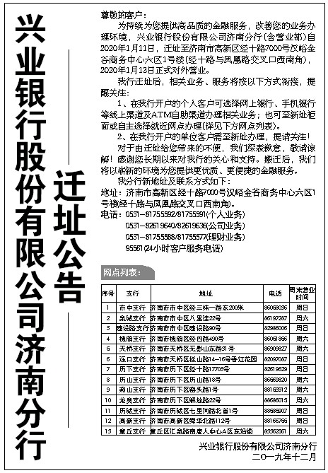 为持续为您提供高品质的金融服务,改善您的业务办理环境,兴业银行股份有限公司济南分行(含营业部)自2020年1月11日,迁址至济南市高新区经十路7000号汉峪金谷商务中心六区1号楼(经十路与凤凰路交叉口西南角),2020年1月13日正式对外营业。