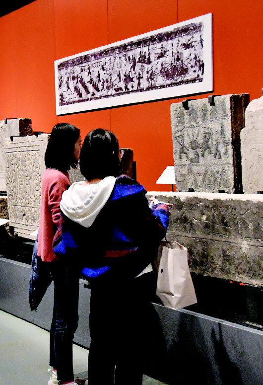 14日晚,山东博物馆内的精美汉代画像吸引观众驻足。